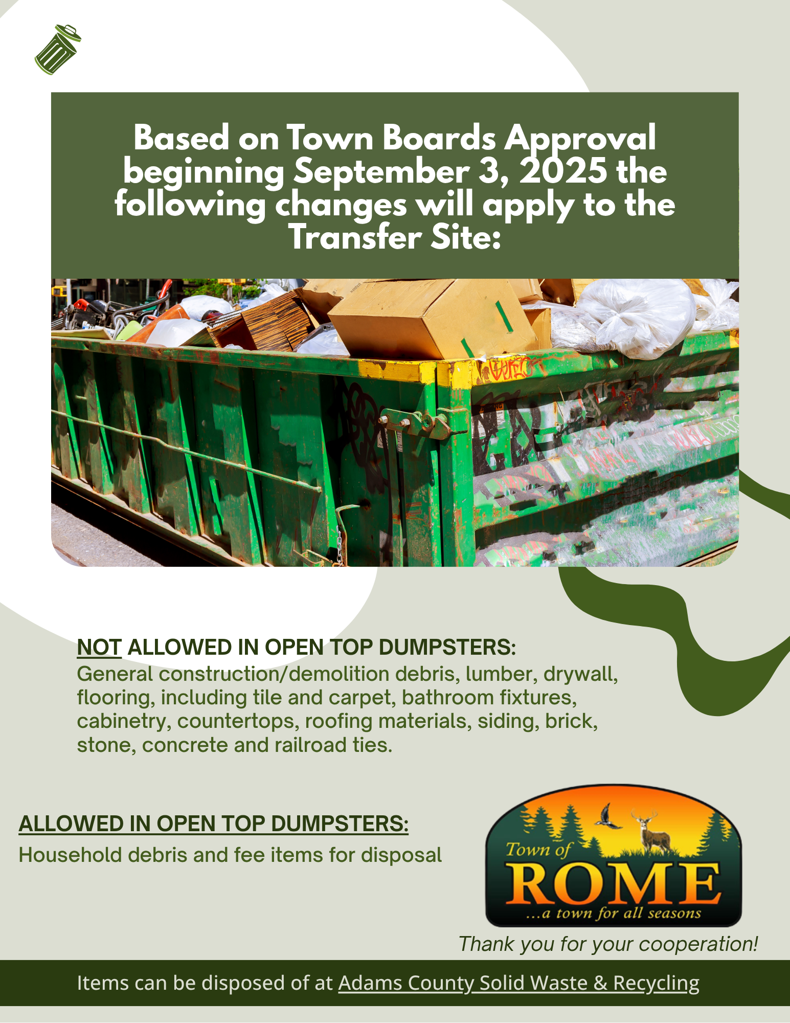 For Adams County Solid Waste & Recycling hours, please visit: https://www.co.adams.wi.us/departments/solid-waste-recycling/hours-location