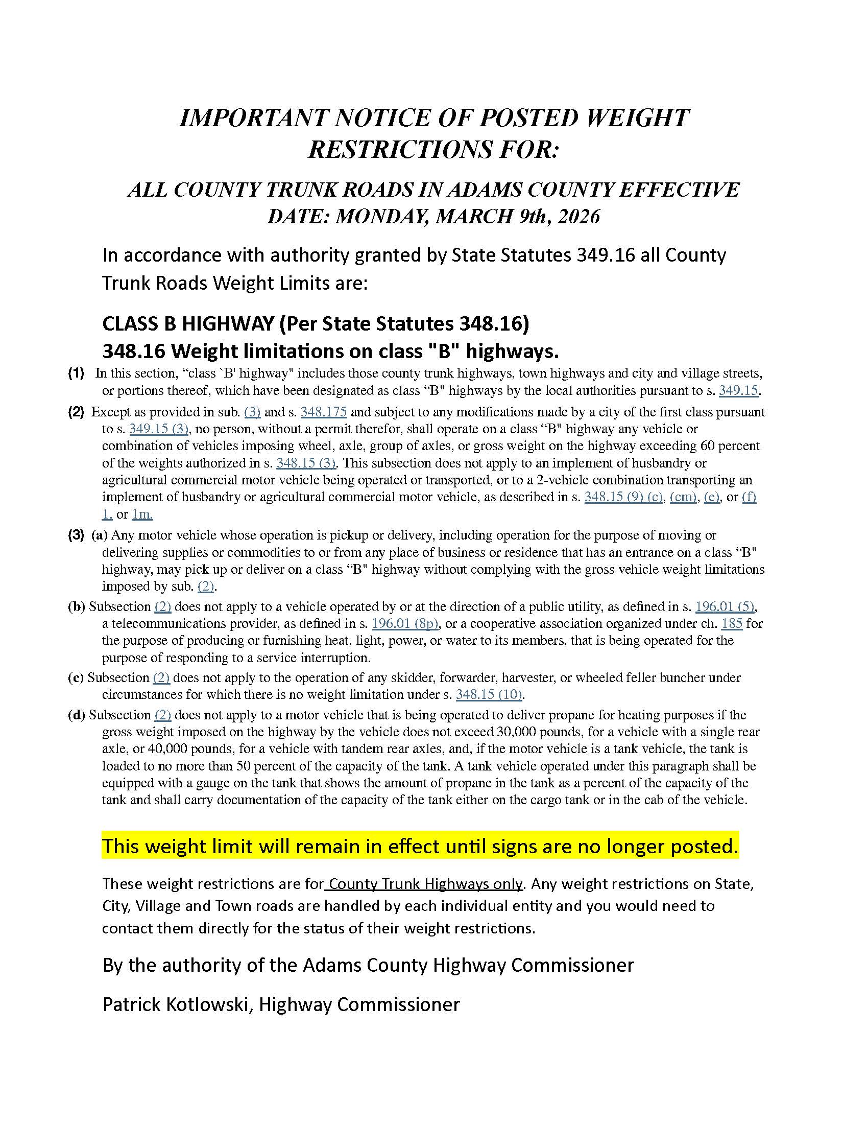 Beginning March 9th, 2026 weight restrictions shall be in effect on all Town of Rome roads until further notice.