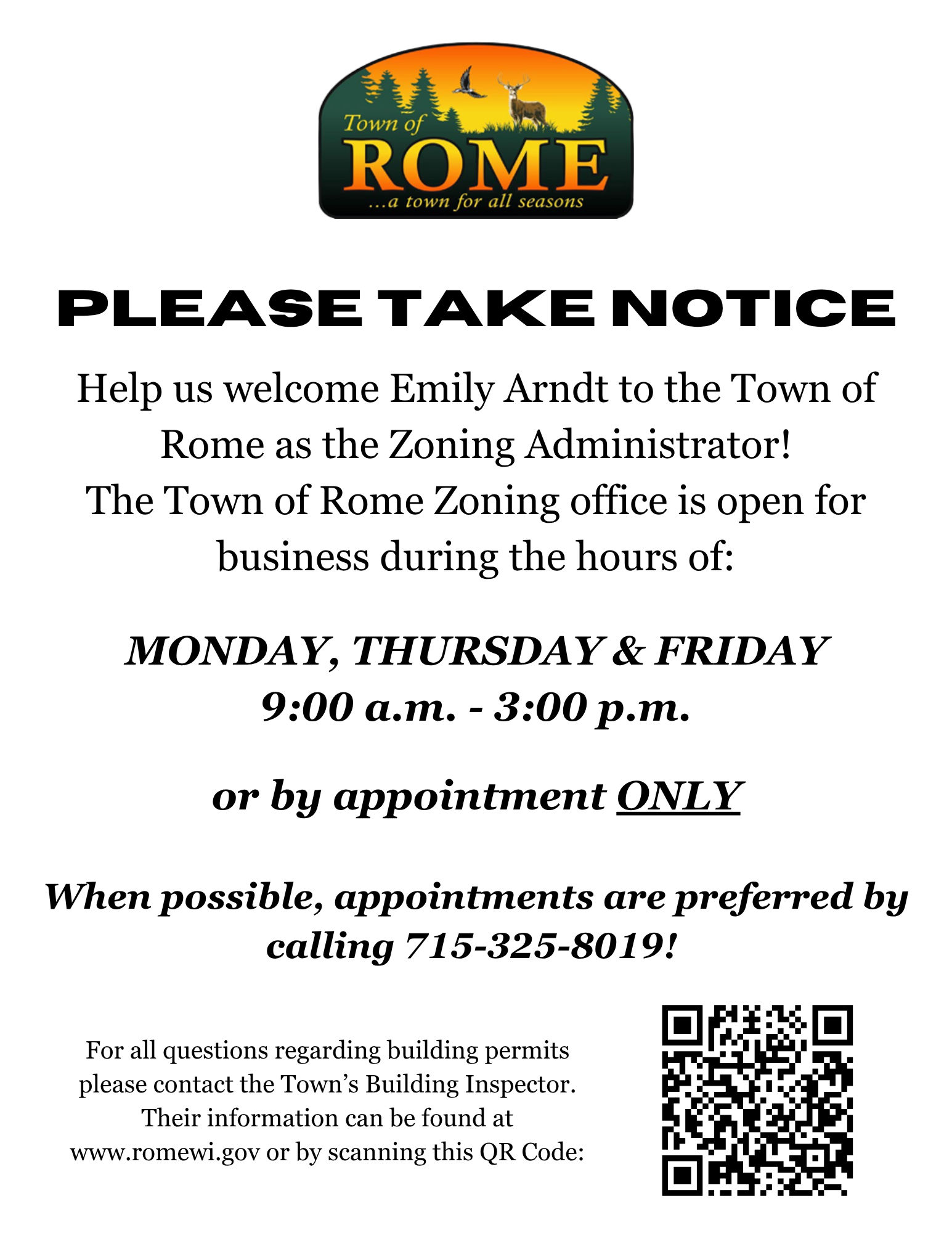 Zoning permits can also be found and submitted on Zoning Hub at https://romewi.zoninghub.com/home.aspx Applications and supporting documentation can be mailed to the Town at 1156 Alpine Drive, Nekoosa, WI 54457.